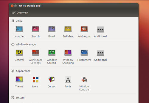 Unity Tweak Tool (da poco disponibile nella versione 0.4.x) ci permette di personalizzare Ubuntu attraverso una comoda interfaccia grafica simile ad Ubuntu Control Center e suddivisa in varie sezioni quali Unity, Window Manager, Apparence e System.