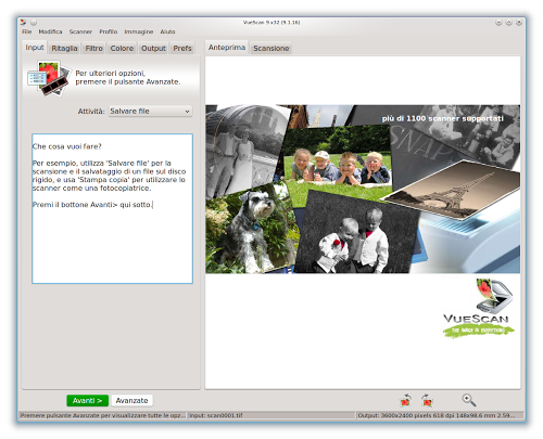 VueScan supporta oltre 1800 scanner (di questi oltre 1100 per Linux) rendendo il software unico nel suo genere inoltre permette di creare profili personalizzati per ogni tipologia di documento da scansionare, utile anche la funziona Stampa Copia grazie alla quale potremo far diventare il nostro scanner in una fotocopiatrice.