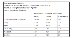 A confermare il primo posto di Android nel mercato statunitense è il servizio Mobilens di Comscore in una recente ricerca sui trend del settore smartphone. Nel mercato USA il sistema operativo mobile più utilizzato è Android con il 51,7 per cento segue Apple con il 38.9% al terzo posto invece troviamo BlackBerry con il 5.4% e successivamente “mamma” Microsoft con 3.2% superiore solo al “povero” Symbian con il 0.5%.