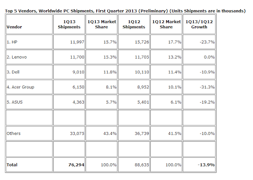 A segnalarlo è IDC e Gartner la nota società multinazionale leader della consulenza strategica, ricerca e analisi nel campo dell’Information Technology che dopo aver rilasciato alcune discutibili previsioni sui prossimi anni ha rilasciato alcuni dati riguardanti le vendite dei pc desktop e notebook nel primo trimestre 2013 con un calo dell’oltre 11% nel mercato americano.