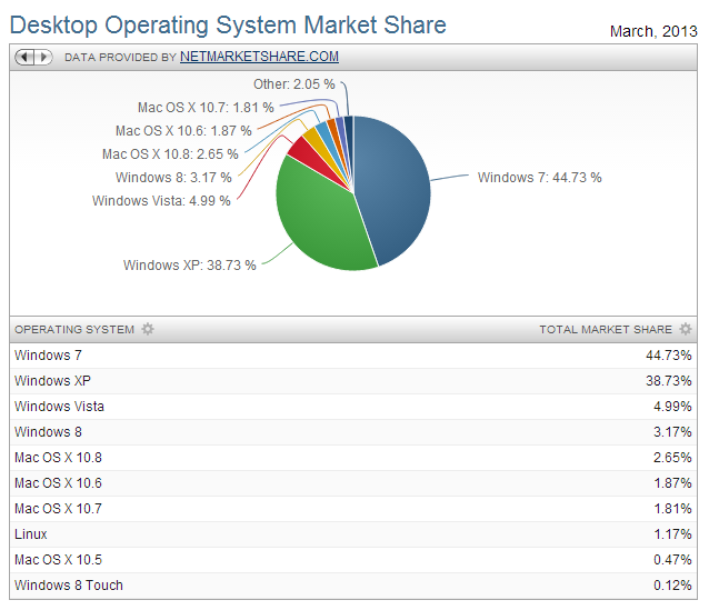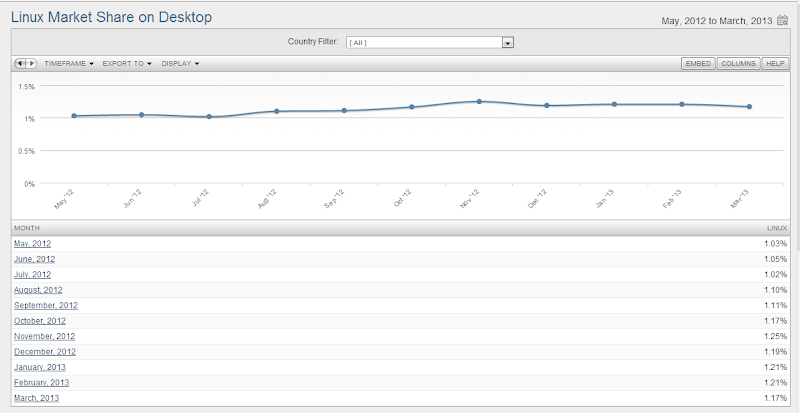 Il portale Net Applications ha pubblicato nei giorni scorsi i dati sul traffico web effettuato nel mese di marzo 2013 confermando l’andamento indicato nei giorni precedenti da Steam ossia un calo da parte degli utenti Linux. Secondo Net Applications gli utenti Linux a marzo sono calati del 0.04% passando da 1.21% a 1.17% niente quindi di sbalorditivo ma questo indica che ben o male gli utenti Linux sono sempre molto pochi confronto sistemi operativi proprietari.