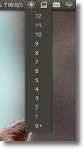 Basta un click sull’icona di Indicator Brightness per avere i valori di luminosità possibile da 0 fino ad un massimo di 15 (poi dipende dallo schermo) il valore corrente è indicato con un puntino bianco posto affianco ad un valore di luminosità.