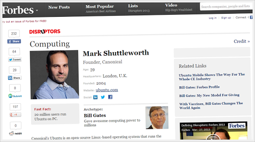 Forbes è un’importante rivista statunitense di economia e finanza famosa in tutto il mondo per la sua classifica annuale degli uomini più ricchi al mondo e la classifica degli uomini che stanno cercando di cambiare il nostro modo di vivere e proprio in questa è apparso nei giorni scorsi niente meno che Mark Shuttleworth fondatore e amministratore di Canonical e Ubuntu.