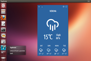 Typhoon è un’applicazione che nasce dai sorgenti di StormCloud con alcune modifiche (oltre il nome) e reso disponibile in modalità gratuita attraverso i PPA dedicati. Sia l’interfaccia grafica che le funzionalità sono identiche a StormCloud una volta avviato basta inserire il nome della nostra località ed ecco attiva l’applicazione. Dalle preferenze inoltre possiamo cambiare il colore della finestra conforme le nostre preferenze, inoltre nel collegamento sul Launcher troveremo la temperatura attuale cosi da poter essere sempre aggiornati anche quando l’applicazioni è minimizzata o è avviata su un’altro spazio di lavoro.