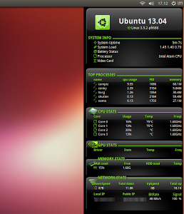 Conky by Pressian è un tema conky ottimizzato per l’utilizzo in Ubuntu con scheda grafica Nvidia con o senza la tecnologia Optimus. Il tema si propone alla destra del nostro desktop con la classica colorazione Nvidia, come da immagine qui a fianco avremo il logo di Ubuntu con la stessa livrea, e informazioni come versione in utilizzo e kernel utilizzato. Verranno visualizzate informazioni di sistema come ad esempio il tempo d’avvio, lo stato della batteria, processore e scheda grafica utilizzata, i processi attivi e le risorse da essi impegnate (CPU e RAM), e dettagli sui vari core del nostro processore con tanto di temperatura, stato della scheda grafica, alle informazioni sul driver, alla memoria del sistema, ed infine dettagli sulla nostra connessione compreso anche il segnale Wifi, IP address ecc. Conky by Pressian è davvero un ottimo tema con il quale potremo avere sempre disponibili informazioni in tempo reale sul nostro sistema.