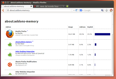 About:addons-memory è un’interessante funzionalità che ci permette di conoscere il consumo di risorse specifico per ogni add.on attivo nel nostro browser. Con About:addons-memory avremo per ogni add.on in funzione i dettagli sulla memoria Ram richiesta e quanto incide nelle risorse del browser. Come possiamo notare dall’immagine gli l’addon di default integrati un Ubuntu richiedono pochissime risorse (Unity Desktop Integration solo 1,75 MB di Ram), però se cominciamo ad installare per esempio il download manager DownThemAll, le cose cambiano con oltre 20/25 Mb richiesti solo da quest’ultimo.
