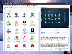 Get Linux è un software open source nativo per Microsoft Windows sviluppato per facilitare la scelta e il download di una distribuzione Linux. Attraverso una semplice interfaccia grafica è possibile scegliere tra moltissime distro, dalle più diffuse come Ubuntu, Fedora, Debian, openSUSE, Arch Linux alle più particolari come ad esempio Deft, Caine ecc. Tutte le distribuzioni hanno una propria icona, screenshot e descrizione (in inglese), numero di versione, ambiente desktop, paese d’origine e dimensioni del file ISO. In basso a sinistra troviamo anche il tasto Download con la possibilità di scegliere la versione 32 o 64 bit. Get Linux dispone anche di utili opzioni, è possibile per esempio creare la cartella dove scaricare il file ISO e decidere cosa fare al termine del download, per esempio se masterizzare direttamente il file immagine in un cd/dvd dall’applicazione, senza utilizzare altri software.