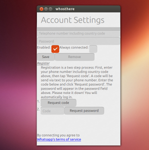 Attualmente il progetto è solo agli inizi e ancora molto instabile inoltre è possibile utilizzare Whosthere solo se abbiamo già attivato WhatsApp sul nostro dispositivo, al primo avvio dell’applicazione dovremo inserire il numero di cellulare associato ad Whosthere e cliccare su “Request Code” per farci inviare un sms con il codice d’autentificazione per accedere al servizio da Ubuntu. Una volta inserito il codice dovremo cliccare su Request Password per richiedere la password per accedere al servizio una volta inserita la password potremo finalmente utilizzare l’applicazione. Durante i miei test non sono riuscito a farmi inviare il codice d’attivazione causa problemi con il server WhatsApp a causa di un bug che molto probabilmente verrà corretto nei prossimi aggiornamento dell’applicazione.
