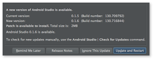 In questa pagina troverete le note di rilascio complete del nuovo Android Studio 0.1.6. Se abbiamo già installato Android Studio potremo aggiornare la piattaforma direttamente dal tool update, In alternativa è possibile scaricare la nuova versione dalla pagina ufficiale del progetto, estrarre il file tgz e lanciare il file studio.sh presente nella cartella android-studio/bin/.