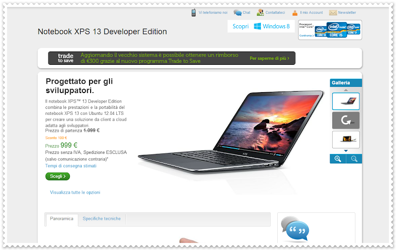 In questi anni Dell ha voluto puntare anche su Linux offrendo non solo alcuni modelli di pc e server con Ubuntu preinstallato ma sviluppando anche alcuni progetto come il famoso DKMS con il quale (in teoria) potremo aggiornare il kernel senza dover reinstallare i driver per le schede grafiche. Dalla collaborazione tra Canonical e Dell è nato il progetto Sputnik dal quale è nato XPS 13 Developer Edition ultrabook sviluppato per creare una soluzione da client a cloud adatta principalmente per gli sviluppatori. Da pochi mesi Dell XPS 13 Developer Edition è disponibile anche nello store Dell Italiano oltre ad altri store Dell come quello inglese, irlandese ecc. In recente post su omgubuntu alcuni utenti che volevamo acquistare XPS 13 Developer Edition nello store ufficiale Dell.com si sono trovati un una confusione totale da parte dell’azienda statunitense. A quanto pare al momento dell’acquisto dell’acquisto appare compare una segnalazione che indica che l’ultrabook non è più disponibile per l’acquisto on-line pregando di contattare il servizio clienti per i dettagli su come ordinare il portatile.