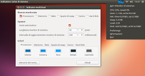 Ubuntu di default dispone di un’applicazione denominata Monitor di Sistema dalla quale possiamo avere informazioni in tempo reale sui consumi di risorse del nostro sistema. Se vogliamo avere sempre sott’occhio informazioni in tempo reale sui carichi del sistema possiamo utilizzare Indicator Multiload. Indicator Multiload è un’applicazione open source dalla quale possiamo avere informazioni in tempo reale sui consumi di risorse del nostro sistema il tutto attraverso un semplice applet nel pannello di Ubuntu. Caratteristica principale di Indicator Multiload è di fornire informazioni su cpu, memoria, rete, swap, hard disk ecc con un semplice click sull’applet. Inoltre è possibile personalizzare le varie colorazioni del grafico inserito nell’applet in modo tale da poter controllare costantemente i carichi di sistema anche senza accedere all’applet.