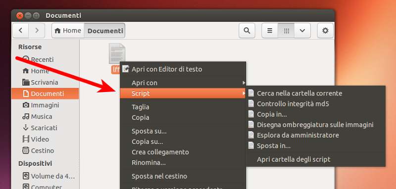 Gli script saranno già disponibili in Nautilus, basta selezionare uno o più file e cliccare con il tasto destro del mouse, dal menu contestuale troveremo i nostri script preferiti. Per rimuoverli basta ripetere l’operazione oppure accedere alla cartella script direttamente dal menu contestuale di Nautilus.