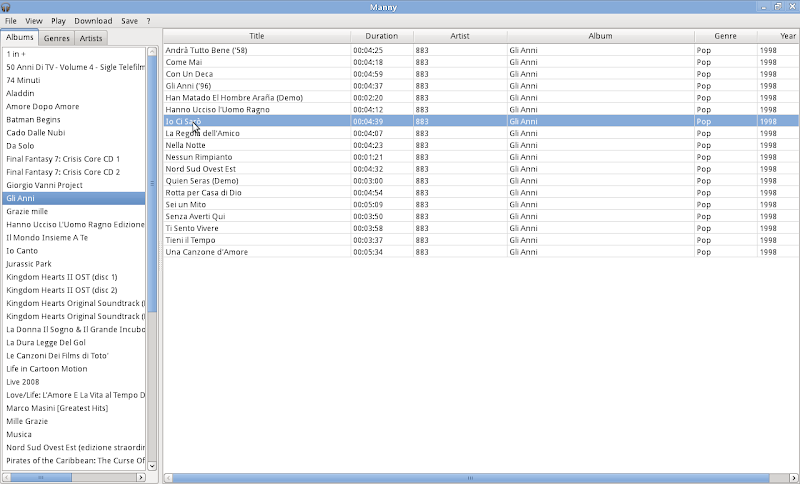 Grazie a Manny potremo avere una semplice interfaccia grafica con la quale accedere al nostro account Google Play Music e visualizzare tutti in esso contenuti. Dall’elenco dei brani (che ricordo abbiamo caricato noi in precedenza con il client Google Play Music Manager) è possibile riprodurli tramite VLC o MPlayer oppure scaricarli nel nostro pc il tutto senza accedere a nessun browser.