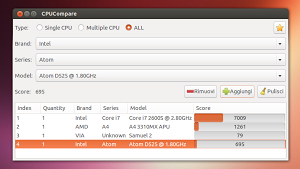 Sviluppato Fabio Castelli / Muflone (autore tra l’altro del blog Ubuntu Trucchi e di altre utili applicazioni come gWakeOnLan, Gespeaker ecc), CPUCompare è un progetto ancora in fase di sviluppo che attualmente ci indica solo le “score” le quali comunque sono già ottime per farci un’idea sulle performance di un processore (per avere informazioni dettagliate possiamo successivamente consultare portali dedicati come ad esempio cpubenchmark).