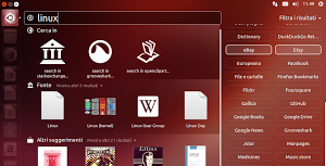 Cliccando in “filtra i risultati” potremo attivare / disattivare facilmente i vari siti, applicazioni ecc con i quali effettuare le ricerche, per migliorare questa funzionalità gli sviluppatori Canonical hanno introdotto una colorazione in grado di differenziare gli scope abilitati con quelli disabilitati.