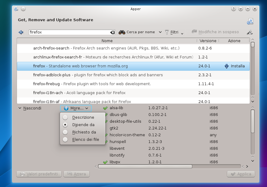 Arch Linux è una distribuzione che non fornisce alcun ambiente desktop o applicazione predefinita, partendo da un sistema base sarà l’utente a scegliere quale desktop environment utilizzare e le applicazioni da installare. Per Arch Linux troviamo anche utili software center che ci consentono di installare e soprattutto effettuare ricerche nelle applicazioni e pacchetti disponili da una semplice interfaccia grafica. Se utilizziamo un’ambiente desktop KDE possiamo utilizzare Apper un ottimo gestore dei pacchetti basato su PackageKit.