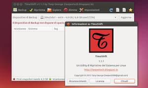 Il team di sviluppatori del progetto TimeShift ha rilasciato la nuova versione 1.1.1 la quale, oltre a correggere alcuni bug, migliora il supporto per Ubuntu 13.10 Saucy oltre a fornire un’utile file sh che ci consente l’utilizzo in qualsiasi distribuzione Linux.