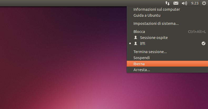 Se funziona potremo quindi aggiungere il collegamento “Iberna” nel menu sessione e utente di Ubuntu Unity come da immagine in alto, per farlo basta digitare da terminale: