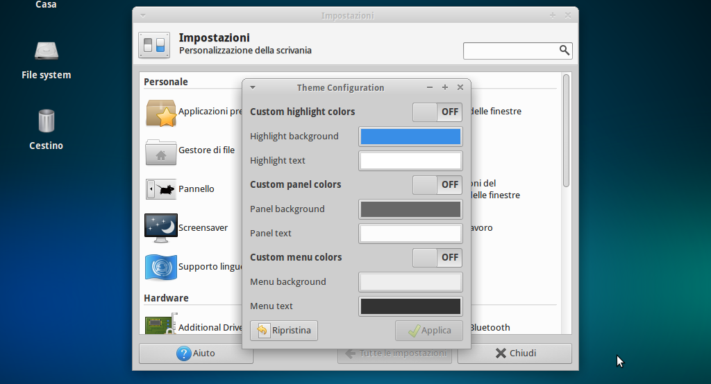Il nuovo Theme Configuration supporta sia i temi GTK2 e GTK3 include inoltre il supporto con le notifiche di sistema segnalandoci le varie modifiche del tema. Con pochi e semplici click potremo modificare il colore predefinito del tema di Xfce passando ad esempio da grigio a nero oppure blue, modificare il colore dei menu e dei pannelli adattandoli ad esempio ad un nostro sfondo preferito ecc.