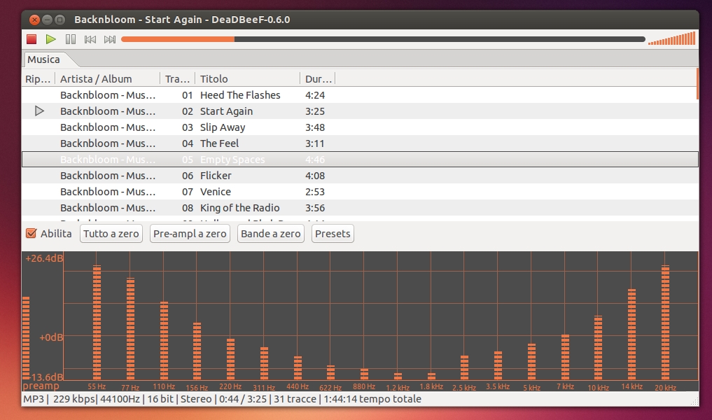 Per chi ha un sistema datato con poche risorse disponibili è consigliabile l’utilizzo di  distribuzioni “leggere” oltre ad utilizzare applicazioni che richiedano pochi MB di ram per avviarsi. Un’ottimo player audio in grado di richiedere poche risorse pur includendo svariate funzionalità e DeaDBeeF. DeaDBeeF è un player audio open source basato su GStreamer con interfaccia grafica GTK+ in grado di includere svariate funzionalità compreso anche un’equalizzatore multi-banda e molto altro ancora.