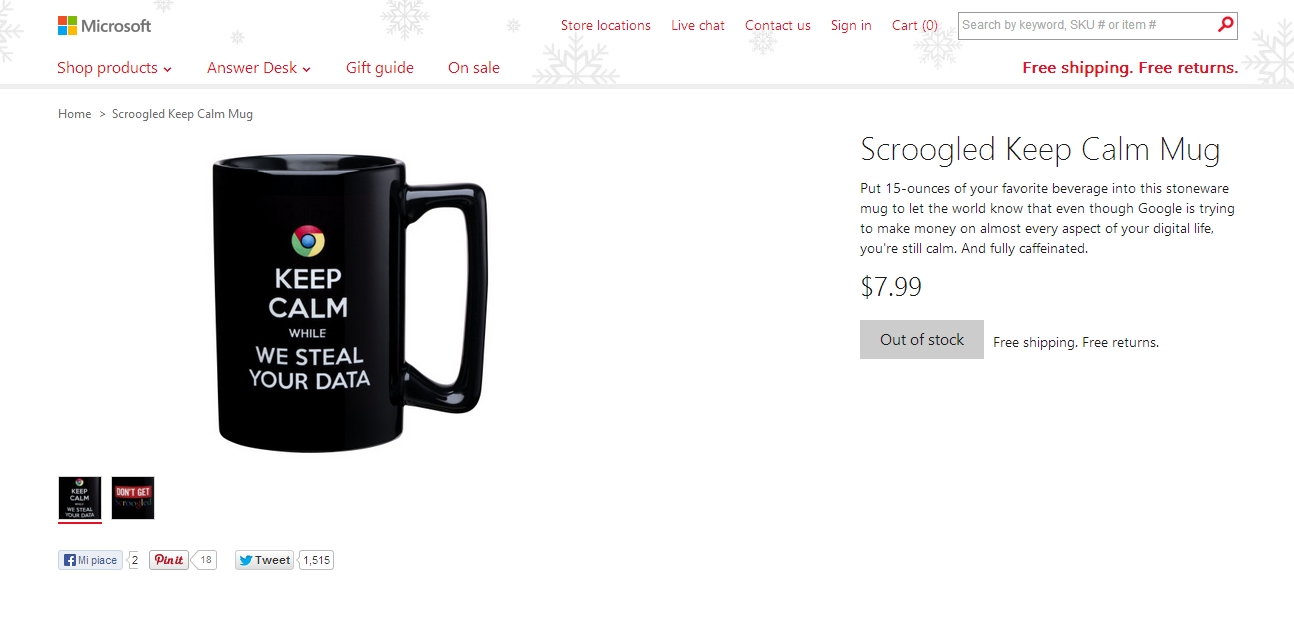 Il nuovo store Anti Google targato Microsoft arriva giusto in tempo per lo shopping natalizio, cosi da poter offrire agli utenti idee regalo che possano aiutare a creare nuove nemici contro l’azienda di Mountain View. Nel nuovo store Scroogled troviamo ad esempio la tazza con il famoso logo di Google con la scritta “Keep calm while we steal your data” che tradotto vuol dire “mantenete la calma mentre vi rubano i vostri dati”, oppure t-shirt con un ragno e la scritta “Step into our we” tradotto “entra nella nostra rete” e capellini “I’m watching you” ossia “Ti sto guardando”, in riferimento al recente caso Datagate.