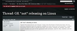 A quanto pare a causa di alcuni problemi (non ben indicati) Gabriel Knight non sarà disponibile per Linux, a confermarlo è Weldon L Hathaway (direttore tecnico di Phoenix Online Studios) con un recente post sul forum pinkertonroad.com.