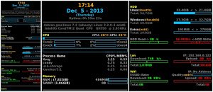 Conky Colors è un semplice tema che si posiziona sulla destra del nostro desktop che ci consente di aver informazioni come dettagli sulla nostra distribuzione come cpu (con il supporto per processori multi-core sia Intel che AMD), processi attivi sul nostro sistema, informazioni sulla RAM e Swap utilizzata, info sul nostro hard disk e partizioni collegate ed info sulla nostra connessione dalla velocità di download e upload al ip ecc.