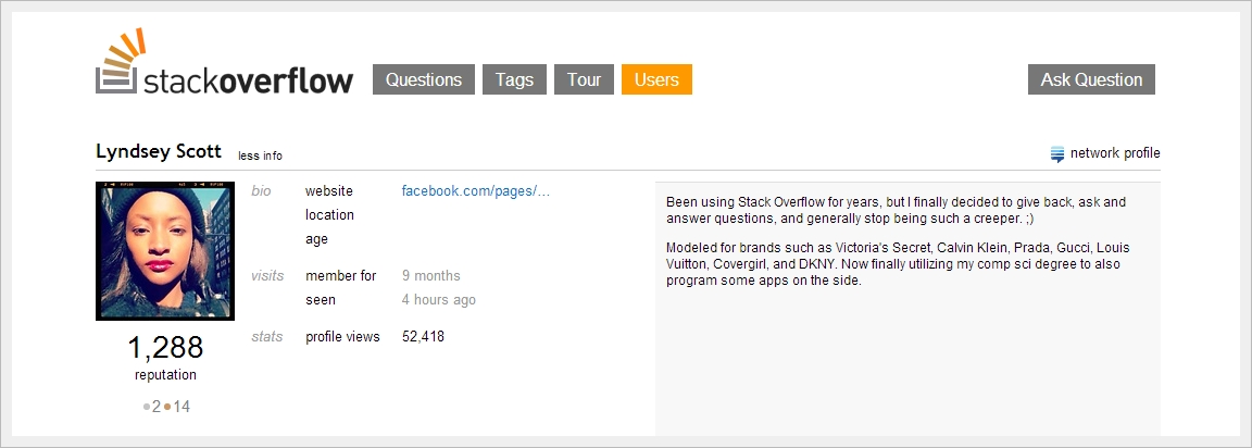 Lyndsey Scott non è solo una top model, nel tempo libero ama programmare in Java. C++ e Python oltre ad aver sviluppato alcune applicazioni per l’architettura MIPS.