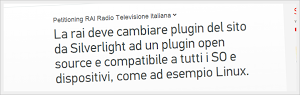 Filippo Falezza, utente Linux, ha deciso di avviare una petizione contro la RAI per far migrare il portale RAI.tv da una tecnologia proprietaria come Microsoft Silverlight a tecnologie open source (come ad esempio HTML5) le quali ci consentono di poter riprodurre i contenuti multimediali da qualsiasi browser senza utilizzare alcun plugin di terze parti.Per maggiori informazioni e per firmare la petizione basta collegarsi alla pagina dedicata del protale Change.org.