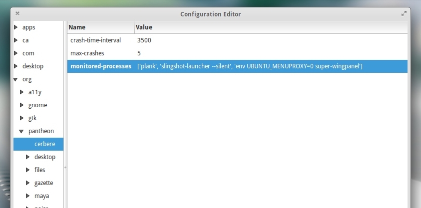 ora possiamo attivare / operare in Super Wingpanel per farlo avviamo Dconf Editor da Menu e andiamo in org -> pantheon -> cerbere in monitored-process inseriamo: