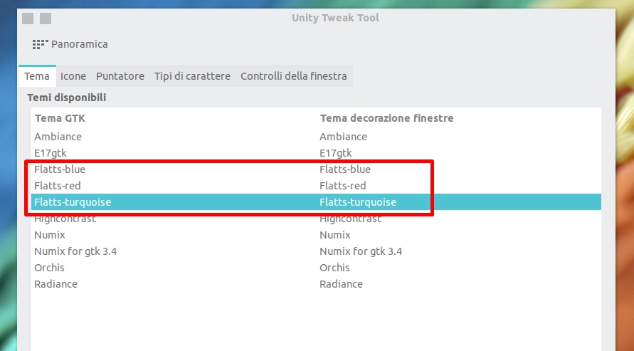 Fatto questo basta avviare Gnome-Tweak-Tools, Ubuntu Tweak o MyUnity o altro tool di personalizzazione e impostiamo il nuovo tema Flatts scegliendo una delle tre varianti e le nuove icone Mylo Xylo.