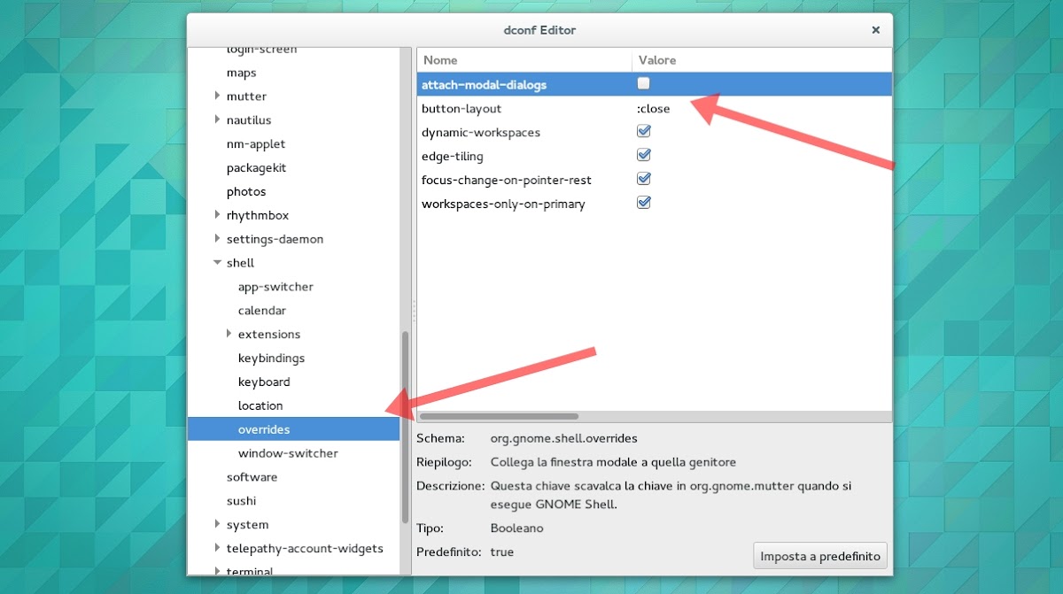 In alternativa possiamo operare anche da DConf Editor avviandolo da menu e andiamo in org -> gnome -> shell -> overrides e togliamo la spunta in attach-modal-dialogs come da immagine sotto e chiudiamo la finestra.
