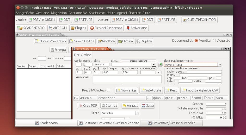 Invoicex è un software gestionale open source multi-piattaforma, sviluppato dalla società TNX, specifico per piccole e medie aziende, artigiani, liberi professionisti ecc. Attraverso Invoicex avremo a disposizione un software facile ed intuitivo con il quale gestire al meglio l’azienda dalla gestione del magazzino, ai preventivi, ordini, gestione delle fatture, contabilità e molto altro ancora. Possiamo installare e gestire Invoicex anche da remoto con dati centralizzati utilizzando MySql Server, il tutto senza la necessità di acquistare licenze aggiuntive, da notare inoltre l’ottima gestione della contabilità tramite prima nota in partita doppia, con piano dei conti personalizzabile in3 livelli con incluse utili funzionalità come la stampa di bilanci da data a data e altro ancora.