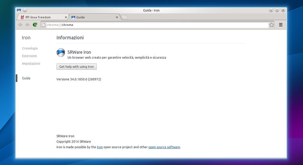 SRWare Iron Browser 34 è disponibile per Ubuntu, Debian, Fedora, openSUSE ecc scaricando il pacchetto deb / rpm da questa pagina. In alternativa possiamo avviare / utilizzare Iron Browser anche senza installarlo, basta scaricare il file tar.gz estrarlo e dare un doppio click al file iron per avviarlo.