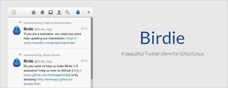 Birdie è un progetto open source che punta a fornire un semplice e leggero client Twitter, dall’interfaccia grafica moderna e minimale in grado di offrire un’ottima integrazione in ambienti desktop come Gnome Shell, Pantheon, Unity, Cinnamon ecc. Nato come semplice client Twitter per elementary OS, il progetto ha riscontrato in breve tempo un notevole successo da parte degli utenti per questo motivo gli sviluppatori hanno deciso di cambiare radicalmente l’intero software con la futura versione 2.0.