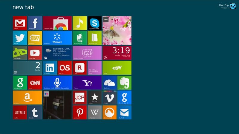 Blue Pup 4 è una derivata di Puppy Linux basata sul “classico” window manager JWM e dotato di una sessione dedicata che avvia una tab di Chromium in modalità Full Screen che ricorda Windows 8 realizzata tramite l’estensione metroTab. La sessione ci consente di accedere velocemente ai nostri siti preferiti il tutto con un look molto simile a quello di Windows 8, nella sessione Standard invece diverse applicazione preinstallate come il client email Mozilla Thunderbird, Skype, presente anche PupControl, PupSnap, PupClockset e wmctrl_1.07.