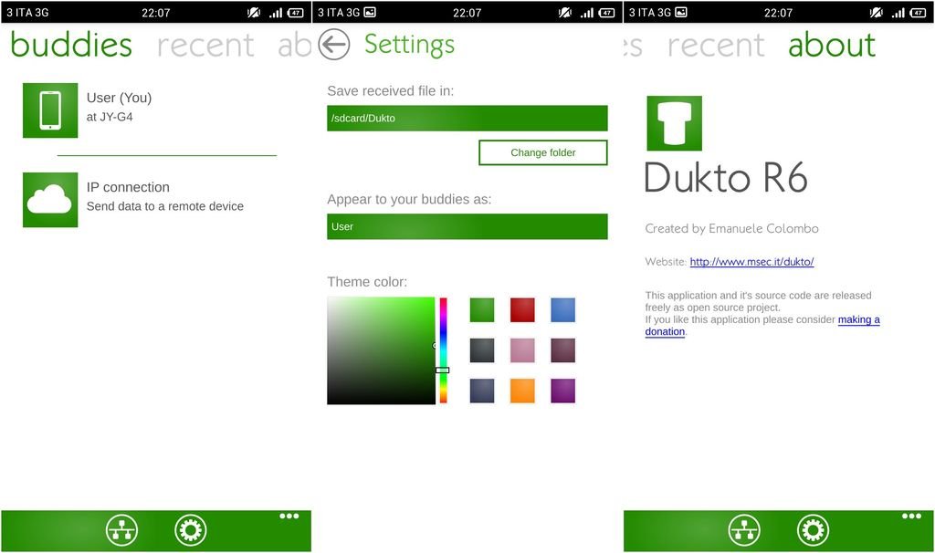 Con Dukto R6 per Android potremo finalmente trasferire facilmente file tra i nostro smartphone, tablet, box tv ecc basato sul sistema operativo mobile di Google al nostro pc con Linux, Windows e Mac. Da notare inoltre la stabilità di Dukto R6 sia nella versione desktop che mobile, con un’interfaccia grafica che ricorda molto Windows Phone, dalle opzioni troviamo la possibilità cambiare il colore predefinito e la cartella nella quale verranno salvati i file inviati dagli altri device