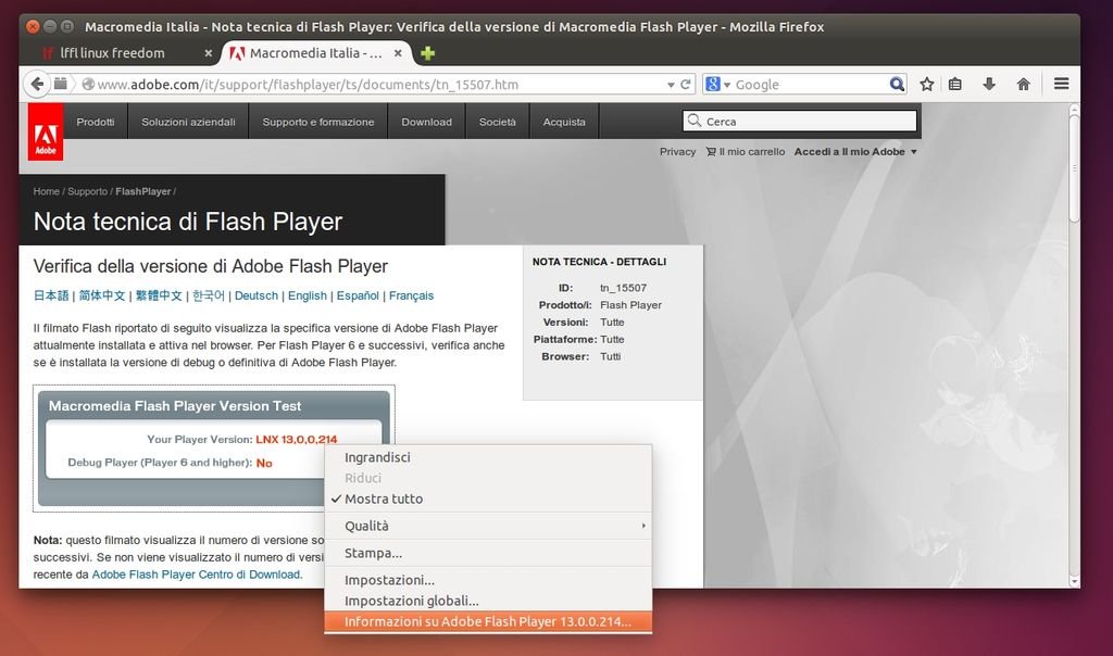 Ora possiamo avviare il nostro Mozilla Firefox ed avremo attivo il nuovo Fresh Player Plugin, possiamo verificarlo accedendo alla pagina del portale Adobe dedicata alla verifica della versione di Flash Player inclusa nel nostro browser.