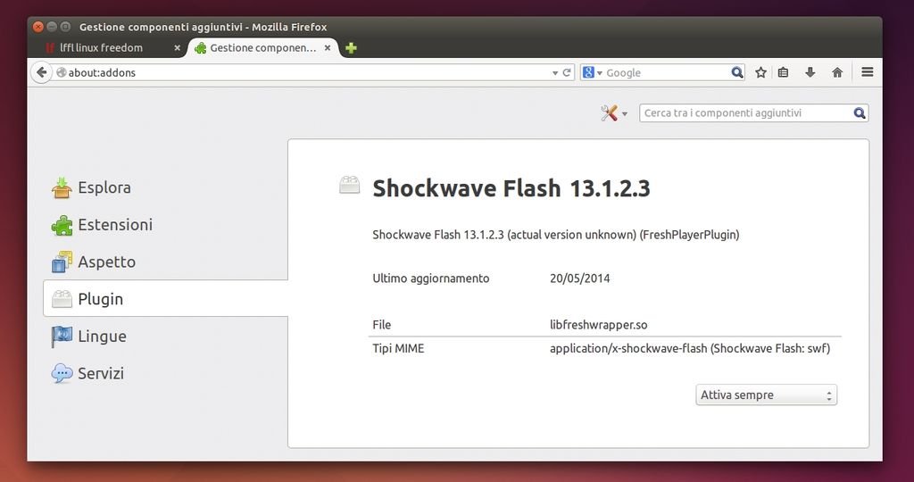 Ora possiamo avviare il nostro Mozilla Firefox ed avremo attivo il nuovo Fresh Player Plugin per verificarlo basta accedere in questa pagina del portale Adobe dedicata alla verifica della versione di Flash Player inclusa nel nostro browser.