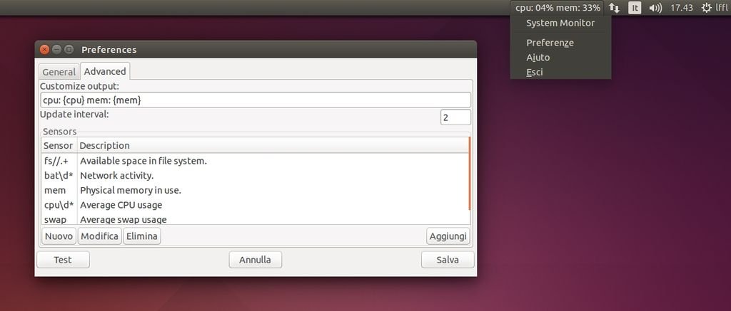 Al termine dell’installazione basta avviare Indicator Sysmonitor da menu / dash.