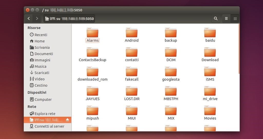 A questo punto basta avviare Nautilus e cliccare sulla sinistra in Connetti al Server e inserire l’indirizzo ftp:// indicato da ES Gestore File e clicchiamo su “Connetti”. Dopo alcuni secondi avremo i file e directory di Android accessibili dal nostro file manager di Linux. Potremo copiare, modificare, eliminare file ecc come se il nostro dispositivo fosse collegato via USB.