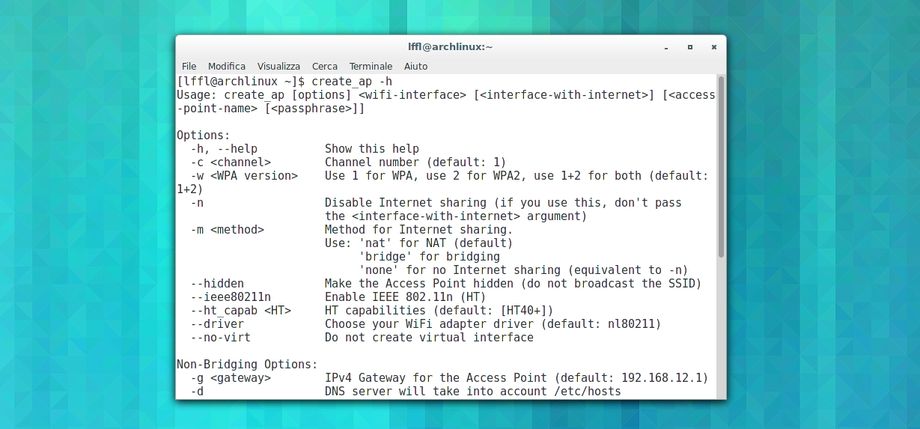 Per conoscere in dettagli tutte le opzioni / features di Create_AP basta digitare da terminale: