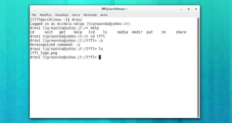 Interessante caratteristica di Droxi è quella di consentirci ci operare nei file, possiamo eliminare, copiare o spostare i file, creare nuove cartelle, caricare, scaricare e condividere file il tutto da terminale, ottimo quindi in server oppure per operare da remoto via SSH ecc.