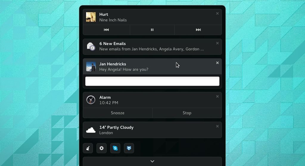 In Gnome Shell 3.14 potremo rispondere facilmente ad messaggio, email ecc direttamente dalla notifica, potremo inoltre operare negli appuntamenti, note ecc. Da notare che il nuovo gestore delle notifiche includerà anche il vassoio di sistema con i vari collegamenti delle applicazioni come ad esempio Skype, Radio Tray, ecc in maniera tale da poter accedere velocemente ad alcune funzionalità anche da applicazione minimizzata.