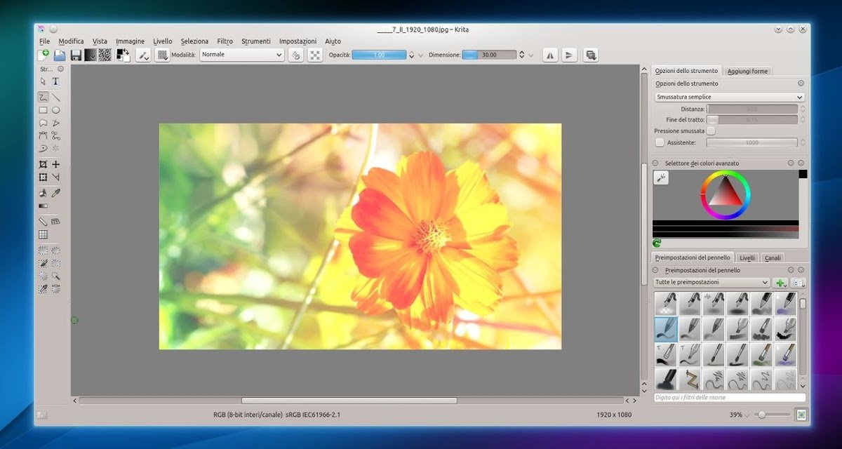 Krita è un’editor d’immagini open source incluso nella raccolta di software per l’ufficio Calligra. Disponibile per Linux e Microsoft Windows anche attraverso piattaforma Steam, Krita fornisce una completa e moderna interfaccia grafica personalizzabile nella quale troviamo diversi strumenti dedicati sia all’editing delle immagini e al disegno con numerosi pennelli, tavolette grafiche, strumenti per tracciare linee, ellissi, rettangoli ecc. Visto gli ottimi risultati con l’attuale versione 2.8 i developer di Krita hanno avviato una raccolta fondi su Kickstarter che consentirà agli sviluppatori di poter accelerare lo sviluppo dell’editor d’immagini open source rendendolo sempre più completo e funzionale.