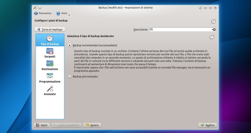Per Kubuntu, Debian, Linux Mint KDE ecc basta scaricare il pacchetto deb e dare un doppio click su di esso e confermare l’installazione. Una volta installato basta andare in Menu -> Impostazioni di Sistema e accedere alla sezione Backup.