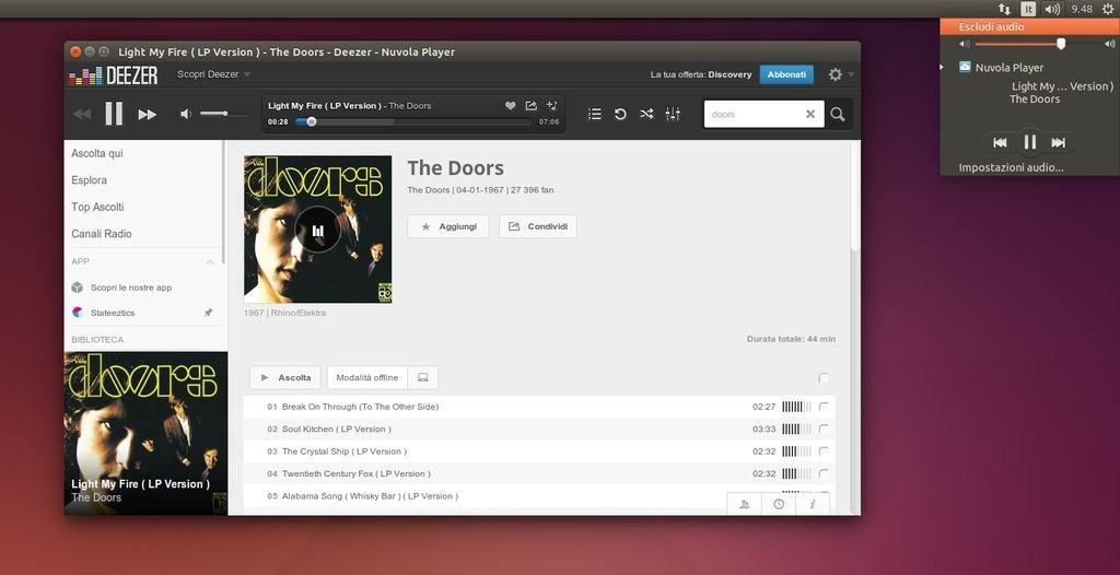 Nuvola Player è un progetto open source che ci consente di avere un player multimediali specifico per i portali web dedicati alla musica via web come Google Play Music, Grooveshark, Amazon Cloud Player, Bandcamp, Deezer, Hype Machine, 8tracks, Pandora, e Rdio . Grazie a Nuvola Player potremo accedere ai vari servizi web senza dover avviare nessun browser, inoltre il software dispone di diverse funzionalità come il supporto con le notifiche si sistema, Sound Menu di Ubuntu e molto altro ancora. Il nuovo Nuvola Player 2.4.0, oltre a svariate correzioni, include il supporto per due nuovi servizi web: Logitech Media Server e This is my jam oltre a diverse migliorie negli attuali servizi.