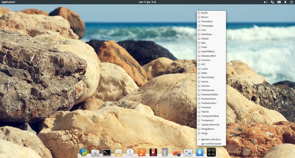 Plank Themer aggiunge un collegamento nella dockbar con il quale avremo l’elenco dei temi disponibili, basta un click in uno di essi per attivarlo, inoltre basta un