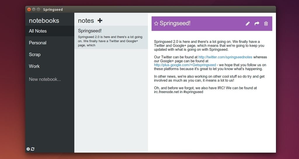 La nuova interfaccia grafica di Springseed 2.0 migliora il supporto per display di netbook e tablet, il nuovo aggiornamento include anche nuove features come il conteggio delle parole in modalità modifica.