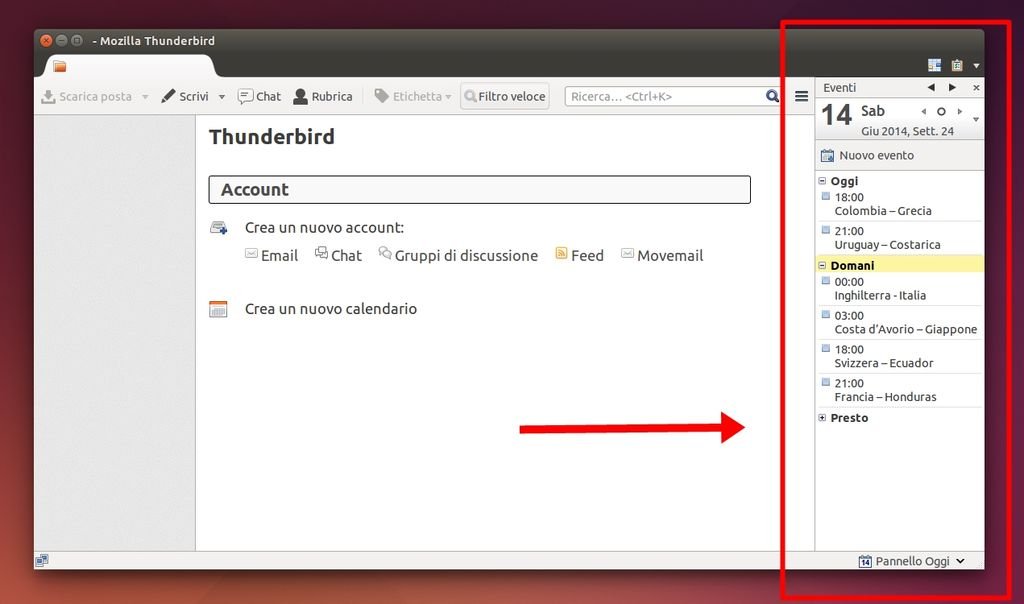 A questo punto avremo il calendario dei mondiali di calcio (con orari italiani degli incontri) sul nostro Thunderbird accessibile da una barra laterale oppure da Menu -> Eventi e attività -> Calendario.